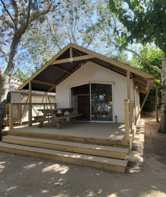 Camping in comfort! The lodge tents (6 people) have 2 bedrooms, a toilet and a beautiful terrace with table and benches. Surface area: 30 m² + 12.5 m² terrace.