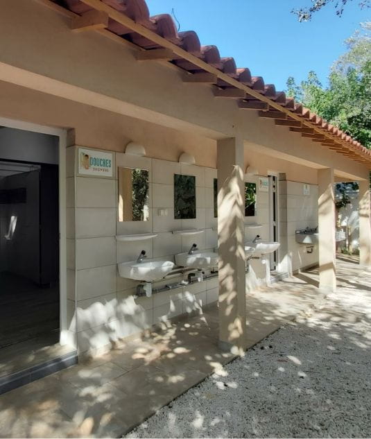 - A renovated toilet block with toilets, hot showers, washing-up sinks (including one for people with reduced mobility), laundry sinks and toilets for people with reduced mobility (shower, toilet and washbasin).